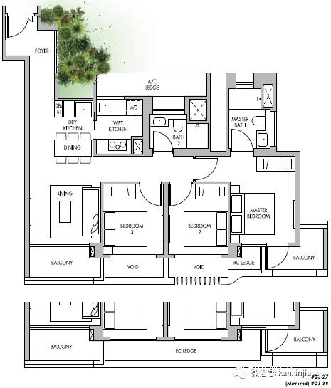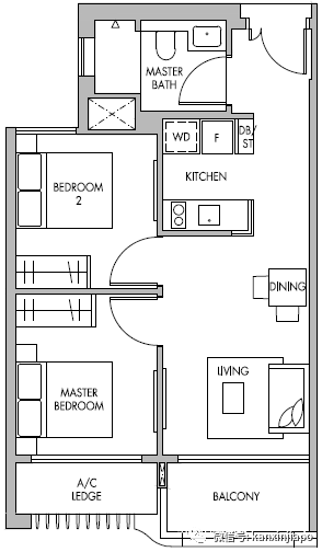 2.两卧房户型,大气格局设计,空间设计合理,双卧单卫,节省空间,室内面积57平方米起(614平方英尺),售价$90.8万起。