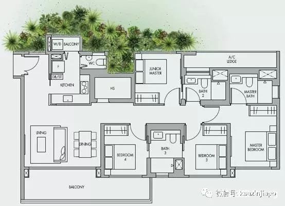 4.四卧房户型,户型方正,面积适中。客厅大开间,直接与阳台相连,使客厅的空间感和光感都得到了增强。套内面积124平方米起(1335平方英尺),售价$208万起。