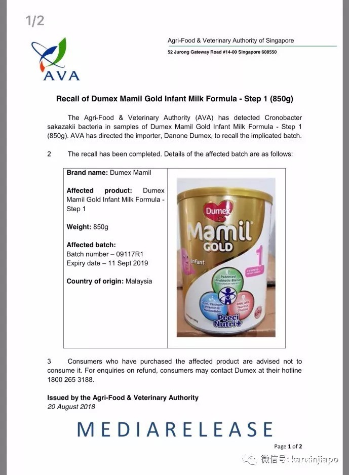 新加坡农粮局与兽医局宣布,紧急召回多美滋婴儿配方奶粉!