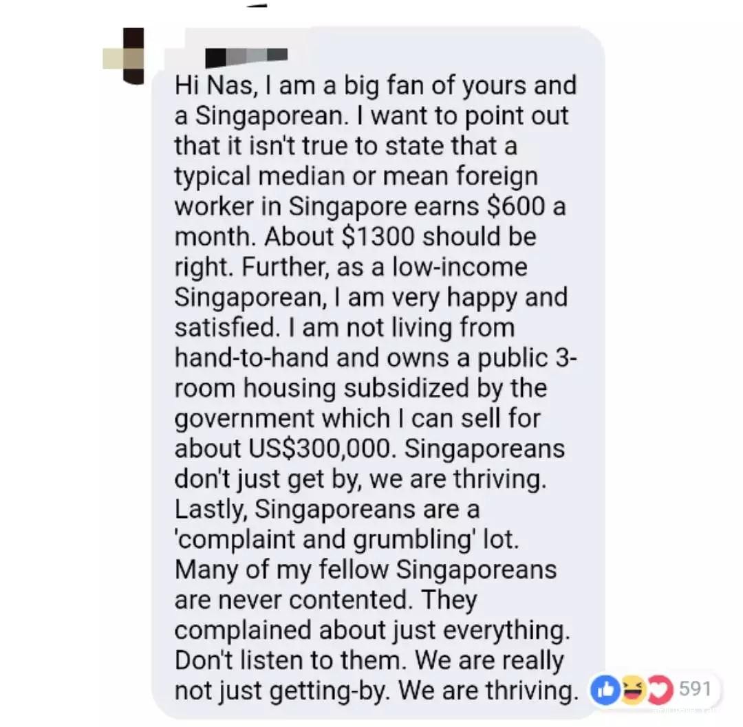 (我是你的粉丝也是新加坡人,我想指出,在新加坡外国劳工的平均工资并不是每个月只有600新币,大约能达到1300新币。此外,作为一个低收入的新加坡人,我没有靠帮扶而自己拥有了一个价值30万新币的三房式组屋。我们并不是勉强度日,我们正在蓬勃发展。最后新加坡人是爱抱怨的人,我很多朋友永不满足,他们只会抱怨,所以不要听他们的。)