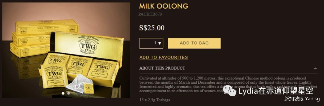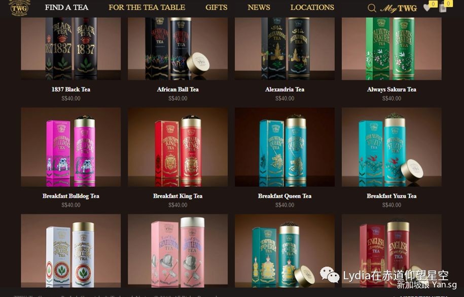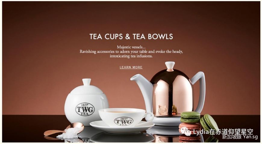 这里的茶主要是——包装好看,风味独特,适合送礼。最有名的当然是TWG这个本地老牌,他不光有茶叶和精美的茶具卖,有些店铺还有甜点、简餐、下午茶提供,坐在里面享用一份悠闲的下午茶,照片照出来晒朋友圈,格调还是很高的。大家可以先去他官网看一下。