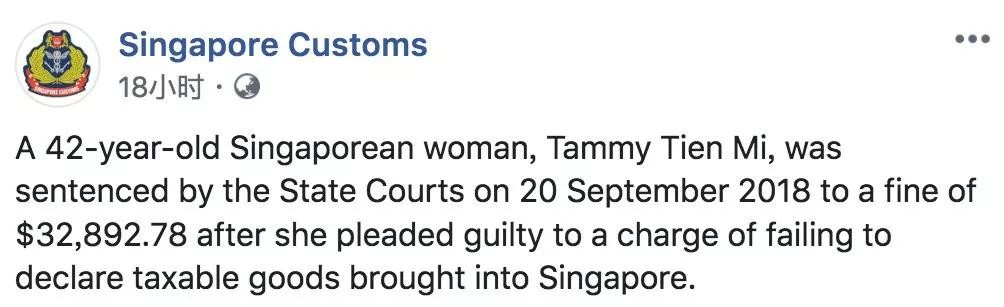 翻译:今年1月27日,女子被海关检查。9月20日,在她承认没有申报携带物品的违法行为后,被国家法院正式判罚缴纳罚金32892.78新币(编者注:如果应缴税款超过10000新币,就要按应付税额缴纳,比如这一事件中的女子,所要交的钱就是:(470,450-650)X 7% = 32,892.78 )。