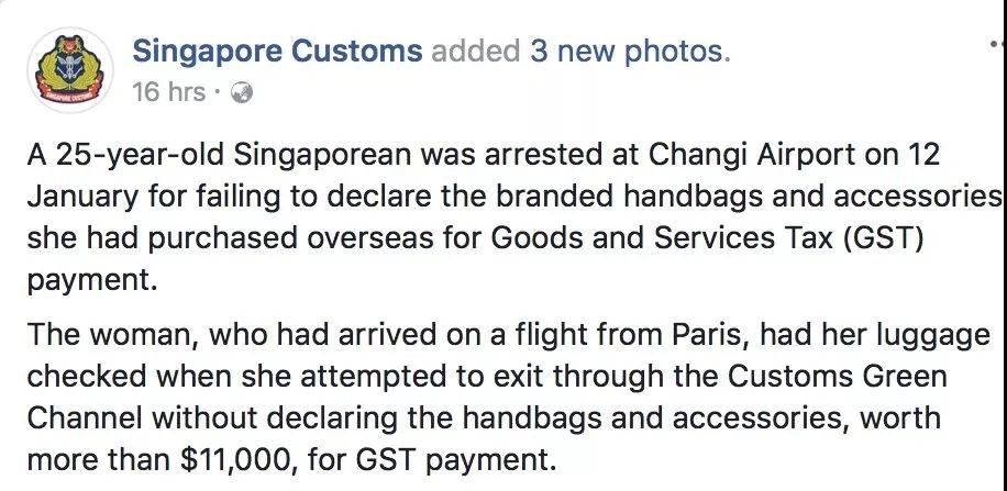 翻译:1月12日,一名25岁新加坡人在樟宜机场被捕,原因是她未向海关申报在海外购买的免税品牌手袋和配饰。这名女子从巴黎飞抵新加坡,在通过新加坡海关是走的是“无申报”绿色通道,海关拦下她进行检查,发现实际上她所持的物品已超过11,000新元。