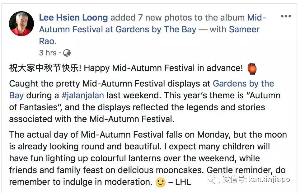 今天李显龙总理已经在Facebook上面提前祝贺大家中秋快乐了~
