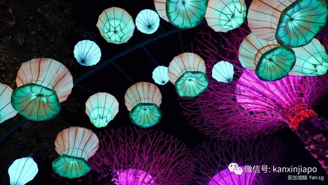 悬浮在空中的花灯,搭配着后面的超级树,有没有种置身于梦幻海底的感觉呢~