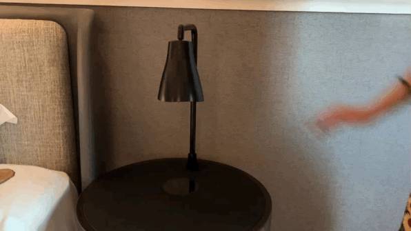 床头灯全靠感应,仅需手靠近就能打开或关闭,很黑科技。USB插座则被隐藏在了桌子的边缘,丝毫不破坏墙面的整体性,十分巧妙的设计。