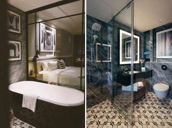 卫生间干湿分离,超大浴缸是每个房间的标配,灰黑色大理石的大面积运用,将极简轻奢的气质娓娓道来。