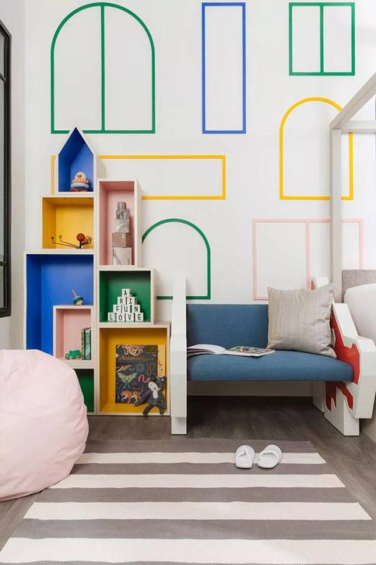 并非换个卡通床单那么简单,房间内还贴心放置了几何木床、积木般拼堆的柜子、造型别致的沙发……电视墙下方被做成了黑板,任小朋友随意涂画,发挥天性。