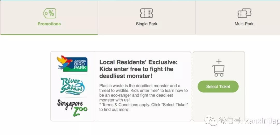 免费的入场券需要提前在“Wildlife Reserves Singapore” 官网预定,每位买成人票的大人可携带一位小孩。点击里面的promotions,就可以看到。