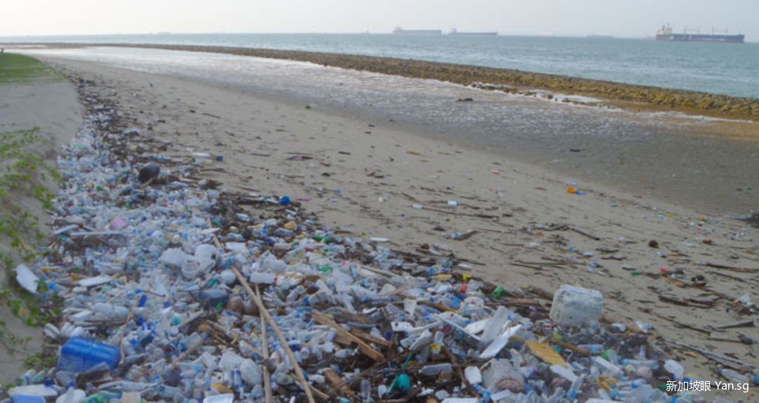 (wild Singapore拍摄的海岸边的塑料堆)