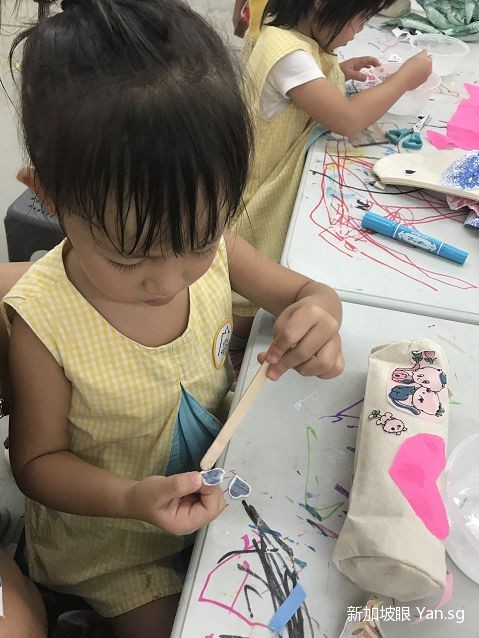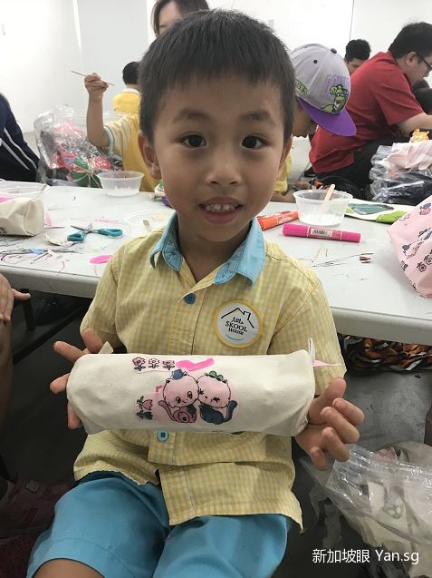手里拿着自己设计的笔袋,小正太的脸上露出了开心的笑容,肯定心里满满的都是成就感吧。