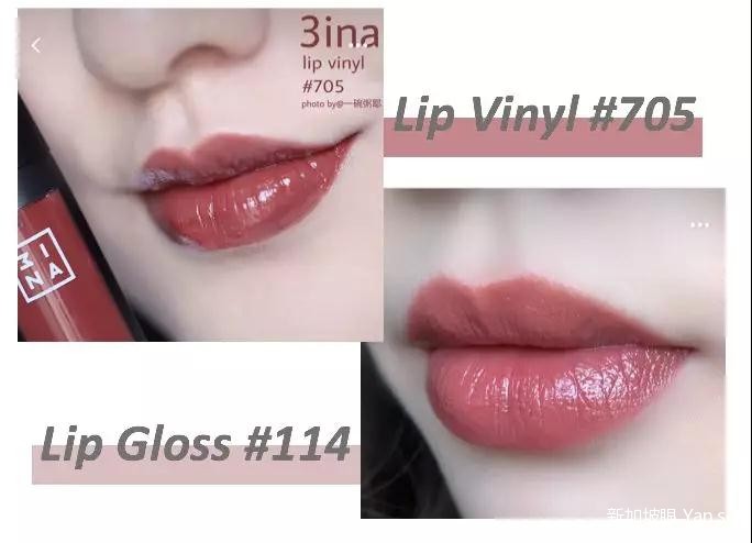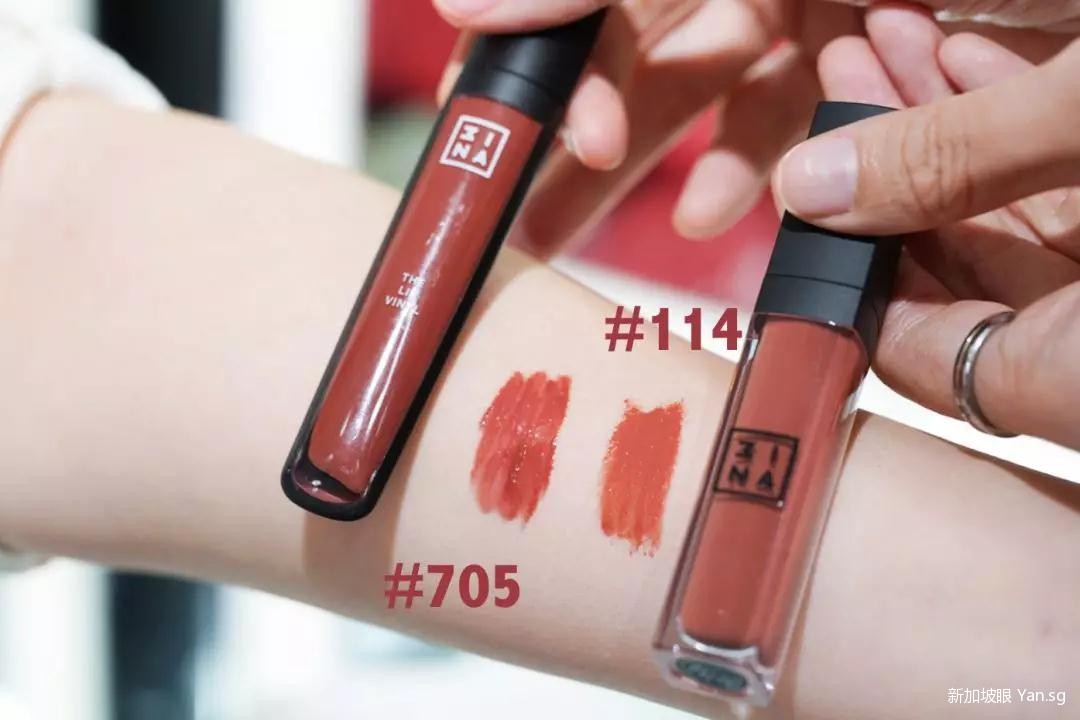 “小红书”上最热门的就是这两个颜色了,从手臂试色就可以看出#705更偏红棕一点,而#114是更纯正的豆沙奶茶色,嘴唇上的试色也可以明显看出差别。