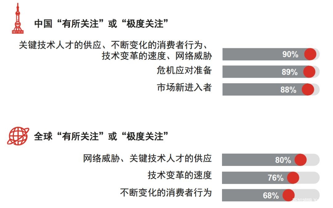 商业方面,90%的中国企业高管列出的主要威胁包括网络威胁、技术变革的速度、关键技术人才的供应以及不断变化的消费者行为。