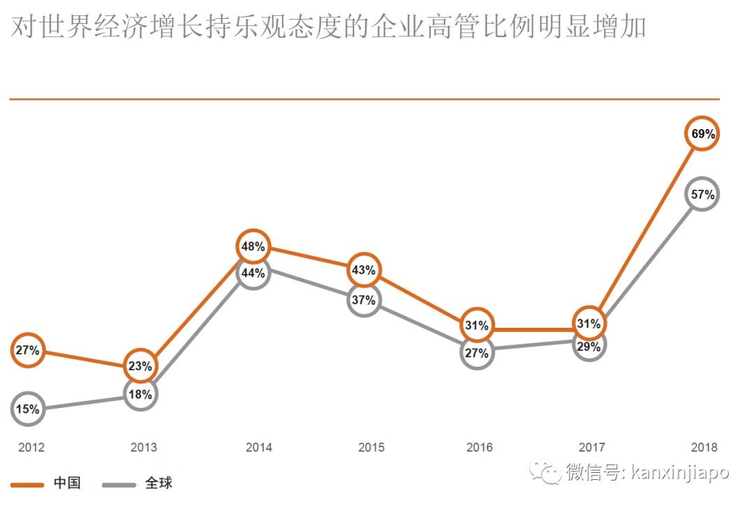调研结果发现,69%受访企业高管认为世界经济增长将会在未来12个月内加速,过去两年这一数据皆为31%。