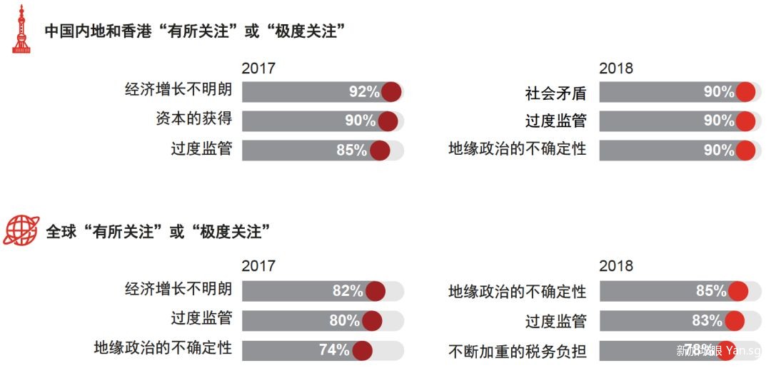至于可能影响企业发展前景的首要经济、政策、社会及环境威胁方面,中国受访者眼中的三大威胁是过度监管、地缘政治的不确定性以及社会动荡。