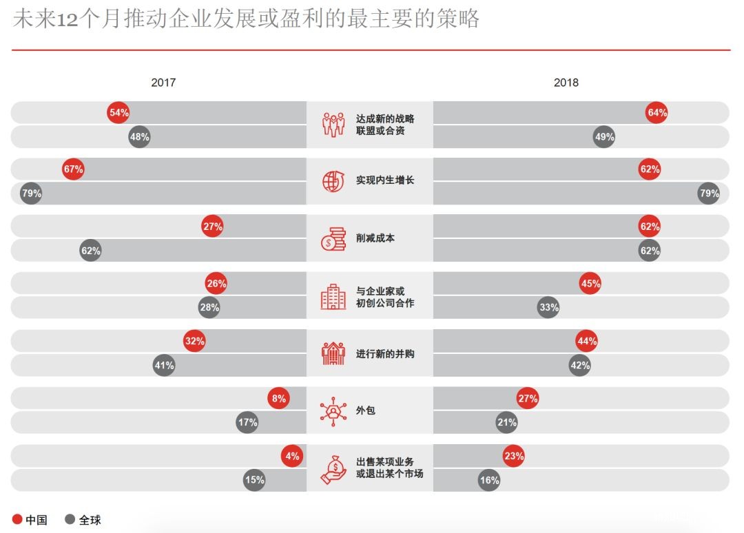 为在复杂和多元的商业环境下推动企业继续发展、盈利,中国64%的企业高管在未来12个月的首要策略,是战略联盟或发展合资企业。