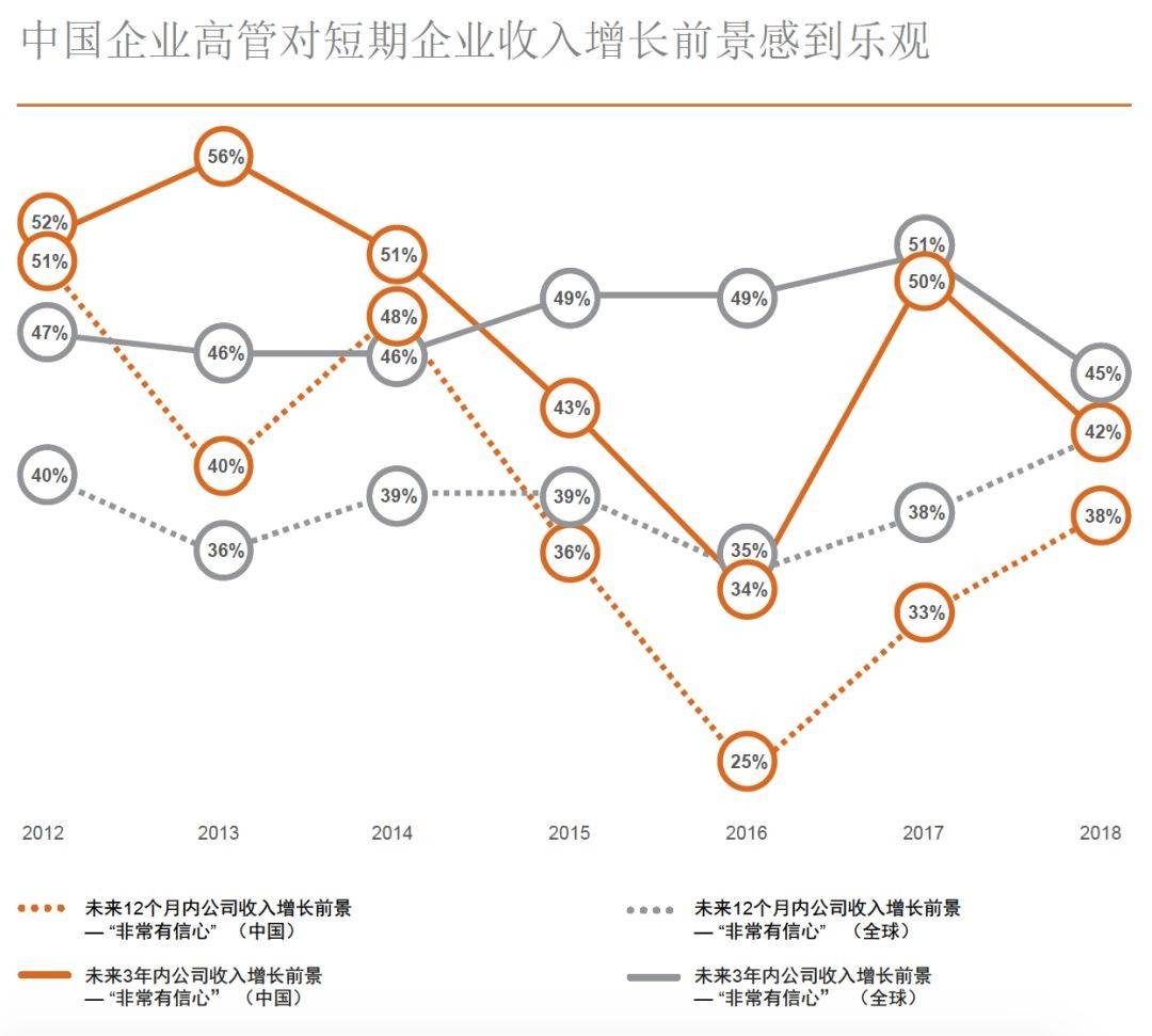 对于自己公司未来12个月内的收入增长前景,38%的企业高管表示“非常有信心”,而2017年的比例为33%。