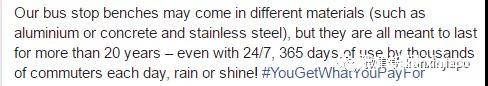 暗戳戳地说了别人的不好,接下来当然就是要夸自己啦:“巴士站板凳需要工作二十年,每年365天,每天24小时,不论阴晴雨雪都要服务上千人”#YouGetWhatYouPayFor(物有所值)