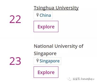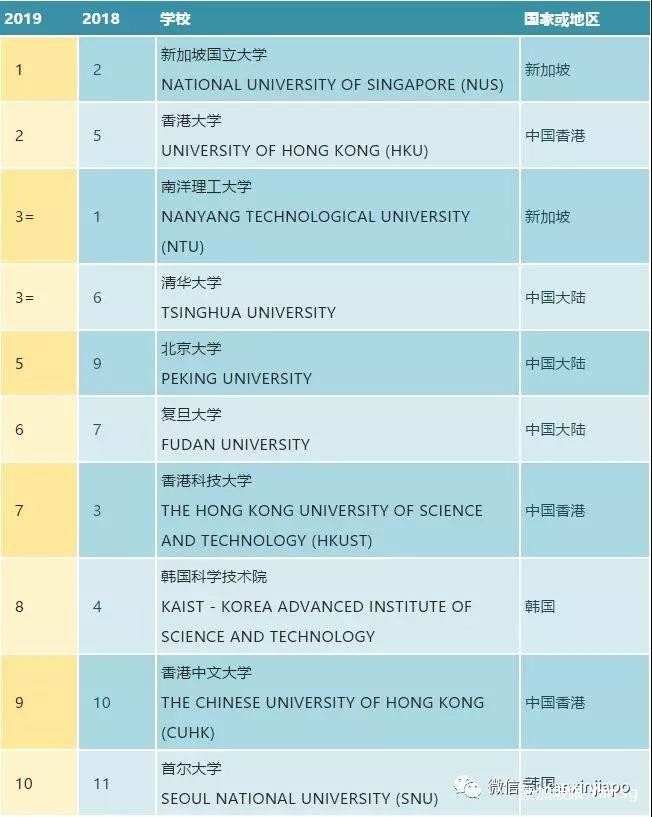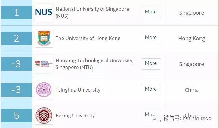 除了NUS回归第一,去年排第五的香港大学回归第二。而去年第一的NTU则和清华大学并列第三。