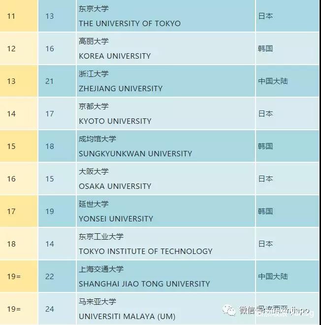 在本次QS亚洲大学榜的前一百名有3所新加坡学校,23所中国大陆学校。我们在这里列出前20名: