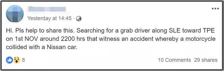 (请帮忙转发。我正在寻找11月1日晚上10点左右,在SLE往TPE方向目睹了一辆摩托车和一辆日产(Nissan)轿车相撞的Grab司机。)