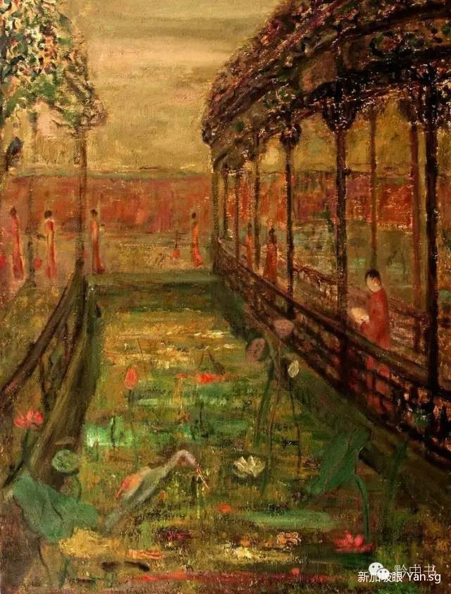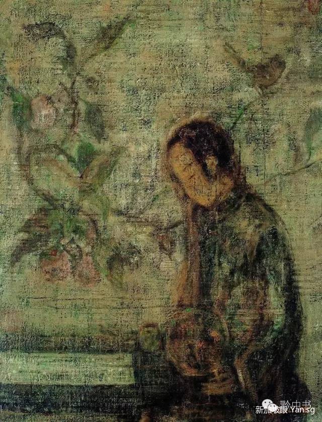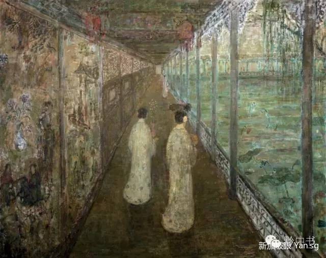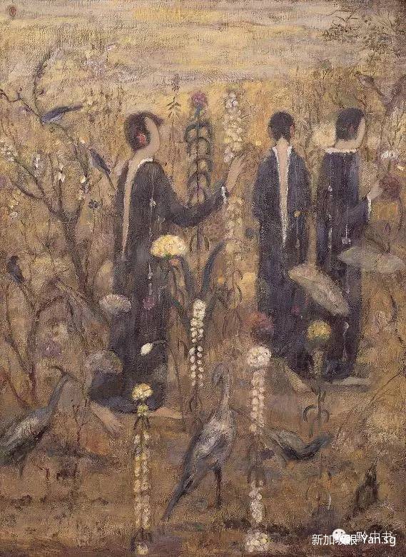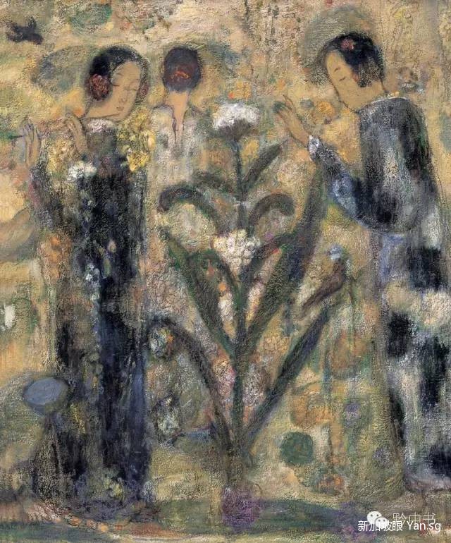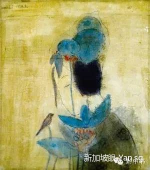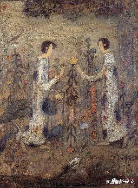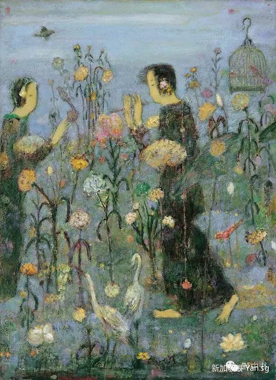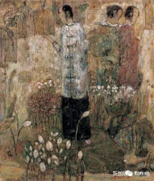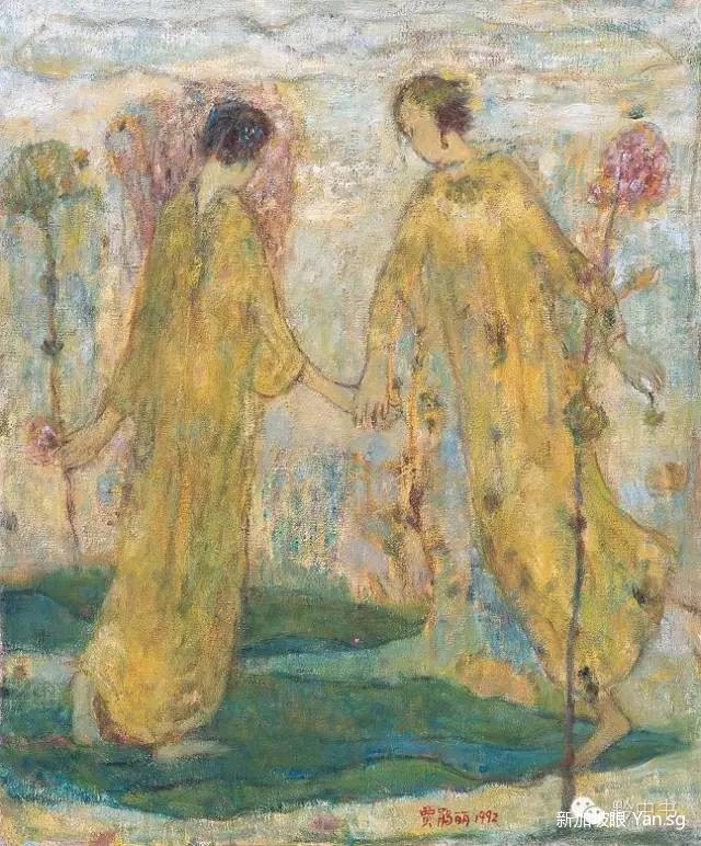 而在那些超现实的作品中,瑰丽的色彩、朦胧的人物,模糊的花草,让人恍然置身于幻觉之中,感觉到某种东方传统的情绪。“我曾多次去到西域,麦积山石窟、敦煌壁画艺术使我兴奋。也许是中国古画中空灵的境界让我迷恋,也许是小说中的某一段文章使我生发了想象,这许多的感动浸在我心里,带着这些迷朦的感动我想用色彩来表达这芳香的自然,欲求用心灵的镜子照亮一个为我所拥有的独特的世界——清晨薄雾的光环世界……”