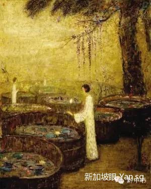 视线移向贾鹃丽的画:画中人袅袅地、幽幽地向我们走来,伴着花影的摇曳、暗香的吹拂,似是而非,若即若离,似曾相识,却又神秘陌生。恍然间,这些温婉的、精灵般的深闺佳丽原来存在于我们的梦中,在那些美好的想象中。
