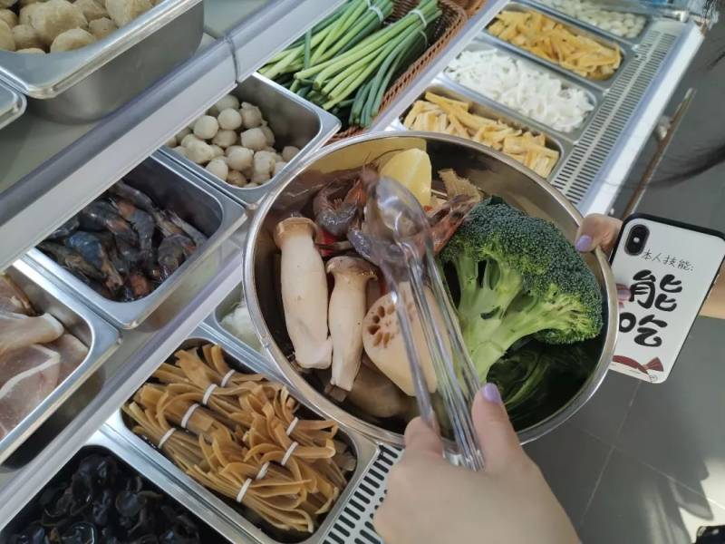 就连麻辣香锅都马虎不得,进门处的一个大冰箱,菜品被码放得整整齐齐: