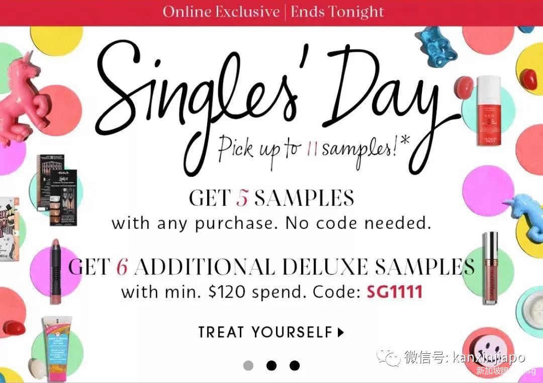 新加坡丝芙兰也来蹭热点,让你选上限11个小样,只限网上双11当天购买。嗯,说实话,这应该是最最最抠门的双11活动了,恶劣程度仅比加价后打折好一丢丢……希望黑五的时候可以真诚一点~