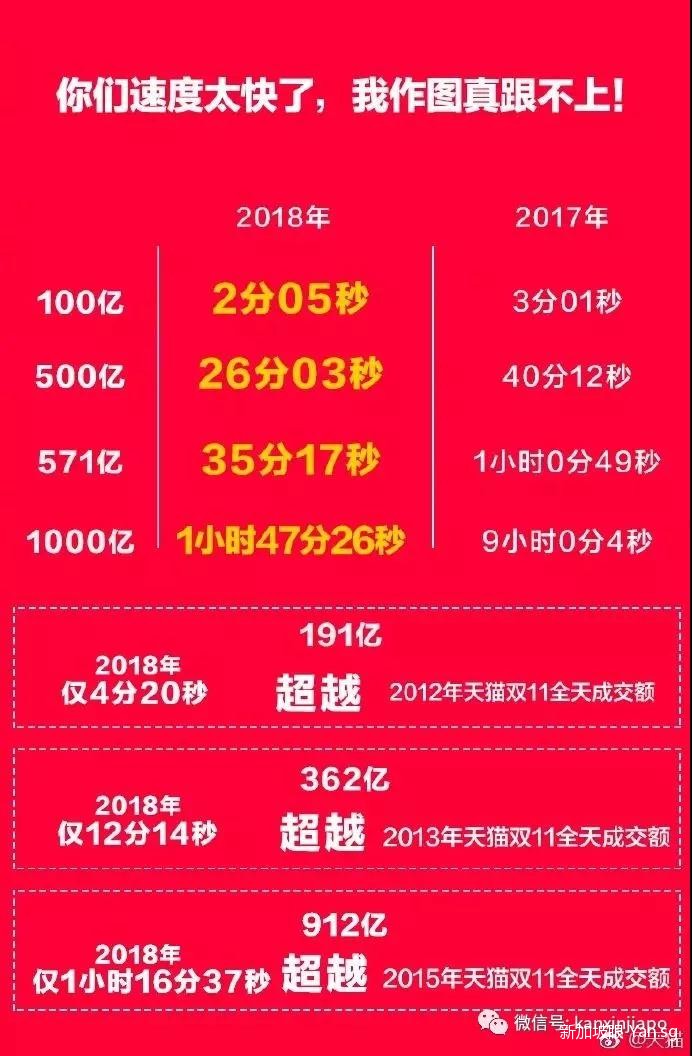 2018天猫全球双11交易额再次刷新纪录:21秒破10亿人民币,1小时47分,突破1000亿元人民币,15小时49分超过2017年双11的全天交易额!