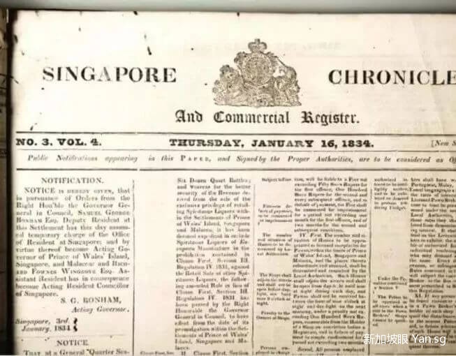 他还创办了新加坡史上第一份英文报纸《新加坡纪事报》,并亲任主编。