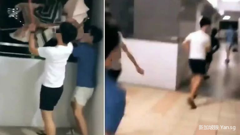 同样发生在昨天,两名十岁出头的男孩一边向组屋楼下抛衣架,一边哈哈大笑。抛完后,五六个小男孩在组屋楼道里奔跑,逃离“做案”现场。还有人还在一旁拍摄,于是这段视频就被曝光在了网上。