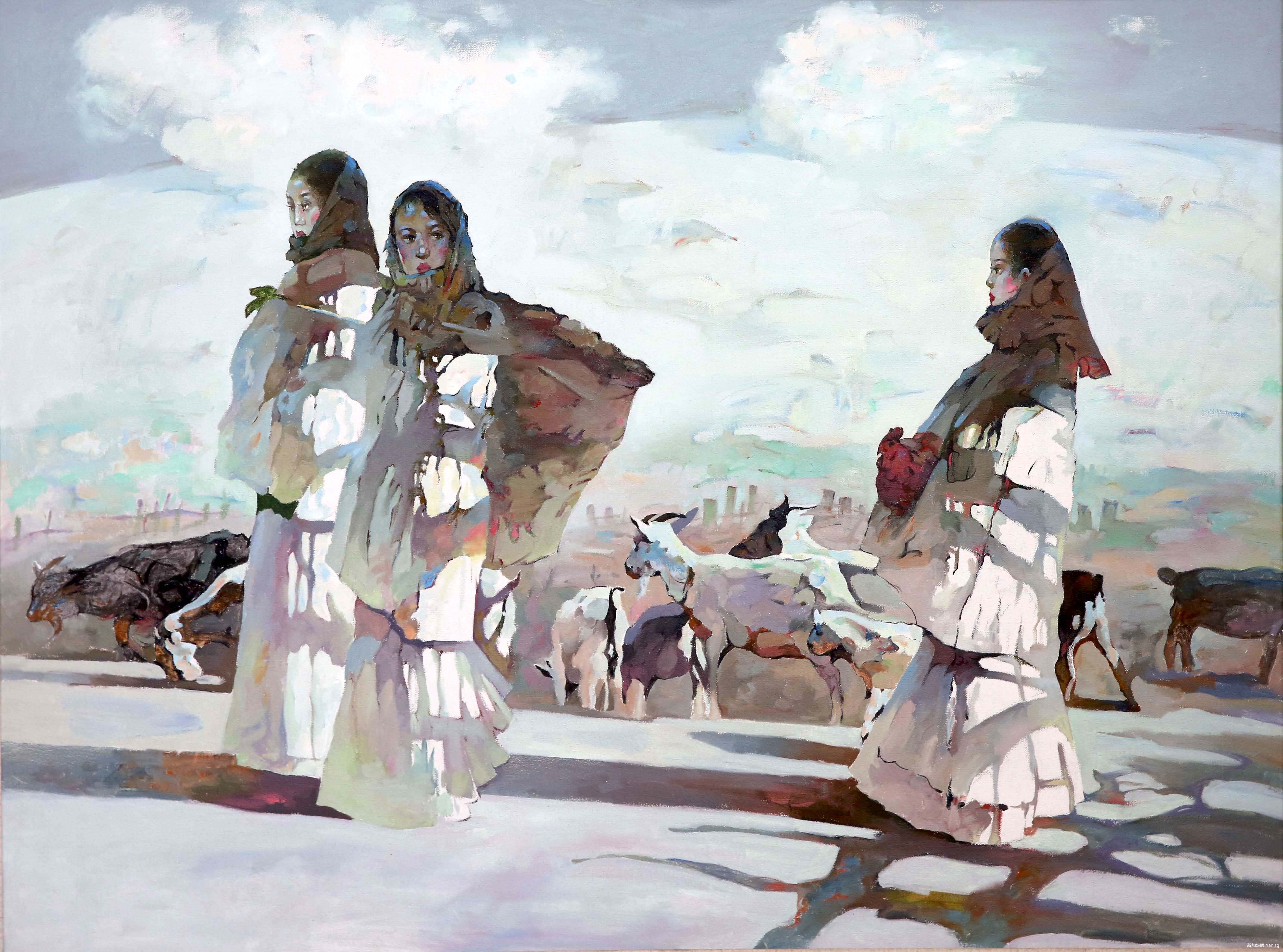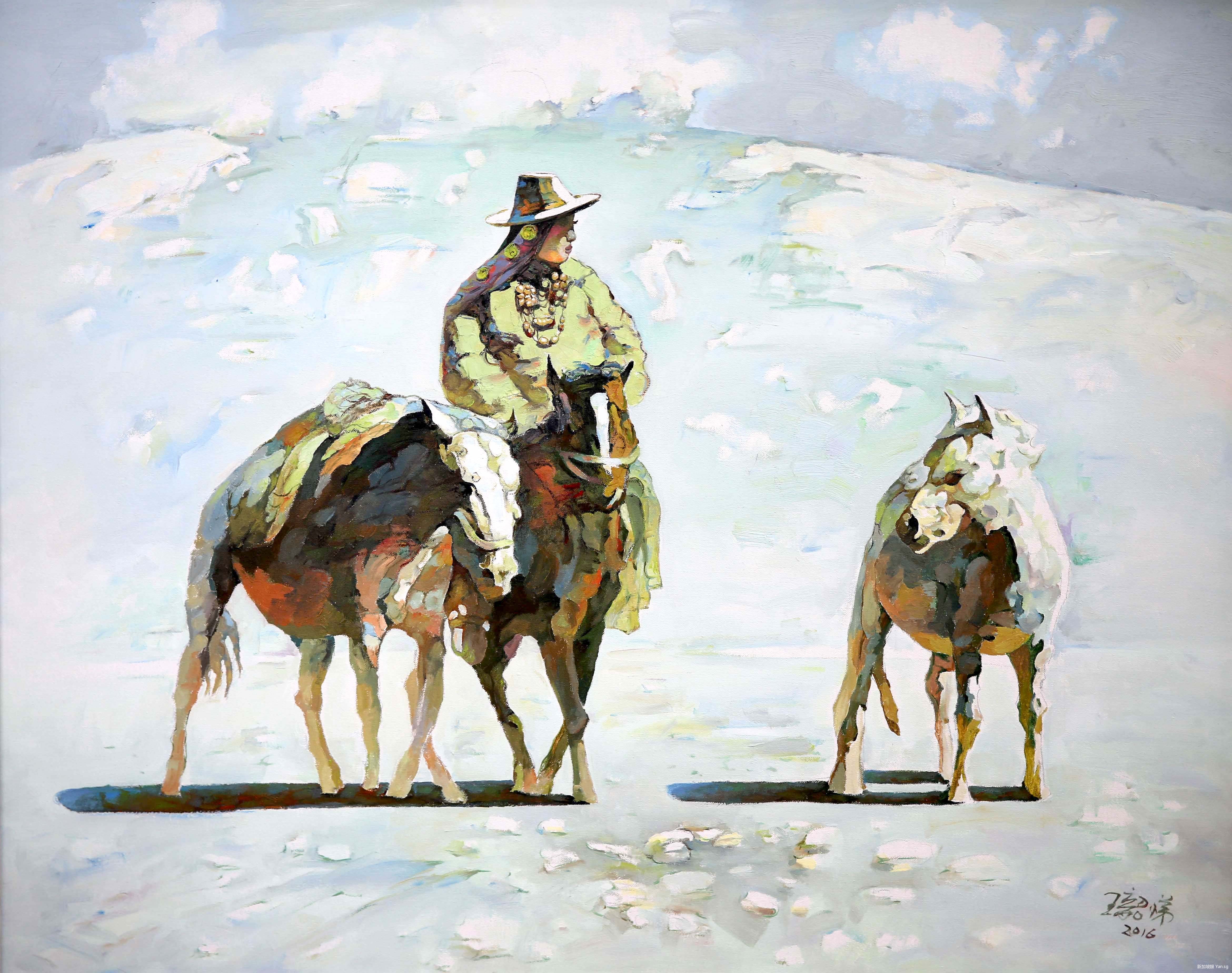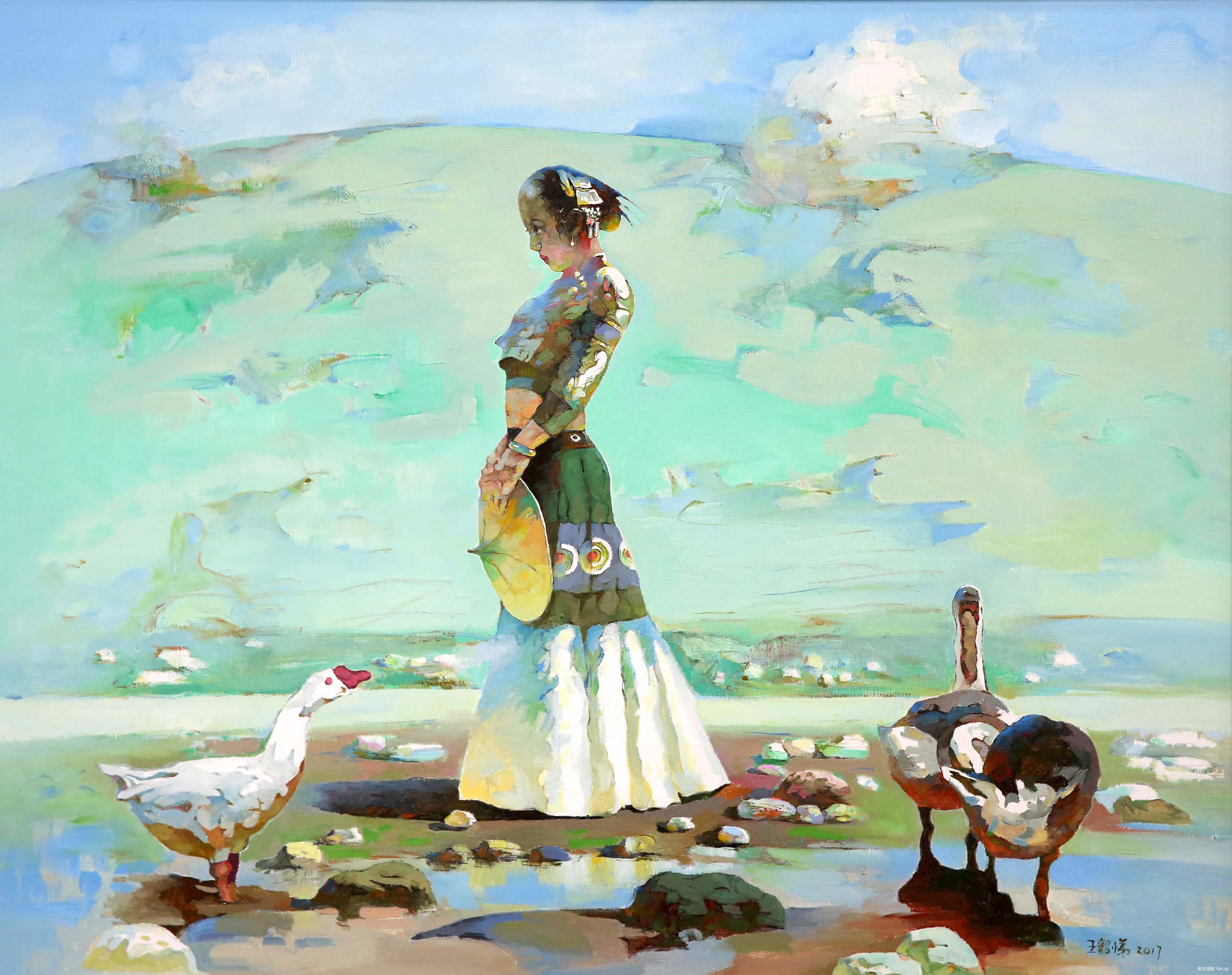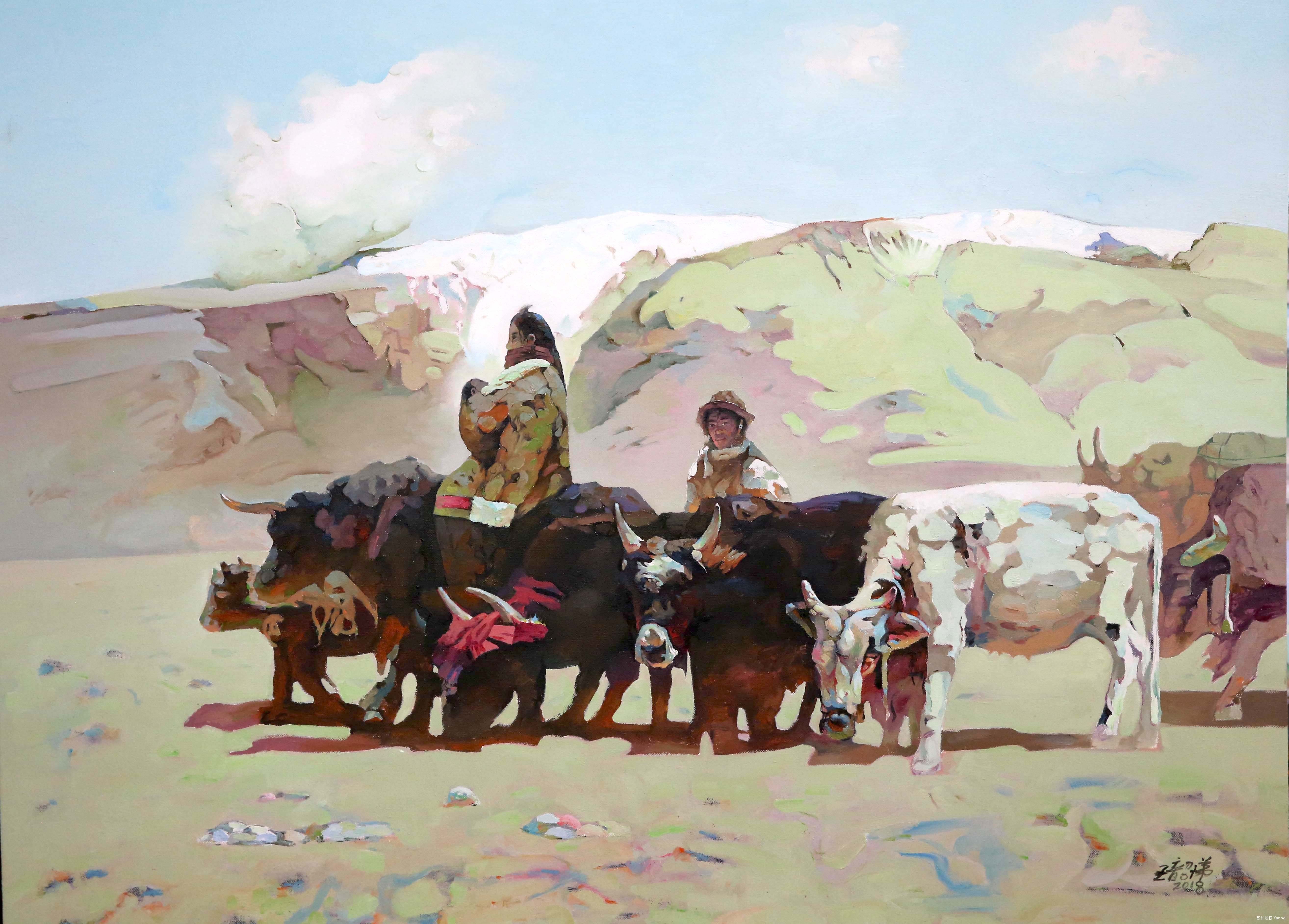 王韶悌的作品具有很强的图式识别性。他喜欢用淡绿色的冷调子来作画,他擅于运用逆光的效果来表现人物的脸庞。他在运用明暗来塑造形体的同时,将色彩的冷暖对比推向唯美的境地。此外,他还擅于运用镜头感,用仰视的手法来拉近人物与天地之间的关系:人物高挑,天空低沉,人与天空的距离并不遥远,似乎白云伸手可触,这有效的塑造了人在高原的特征。