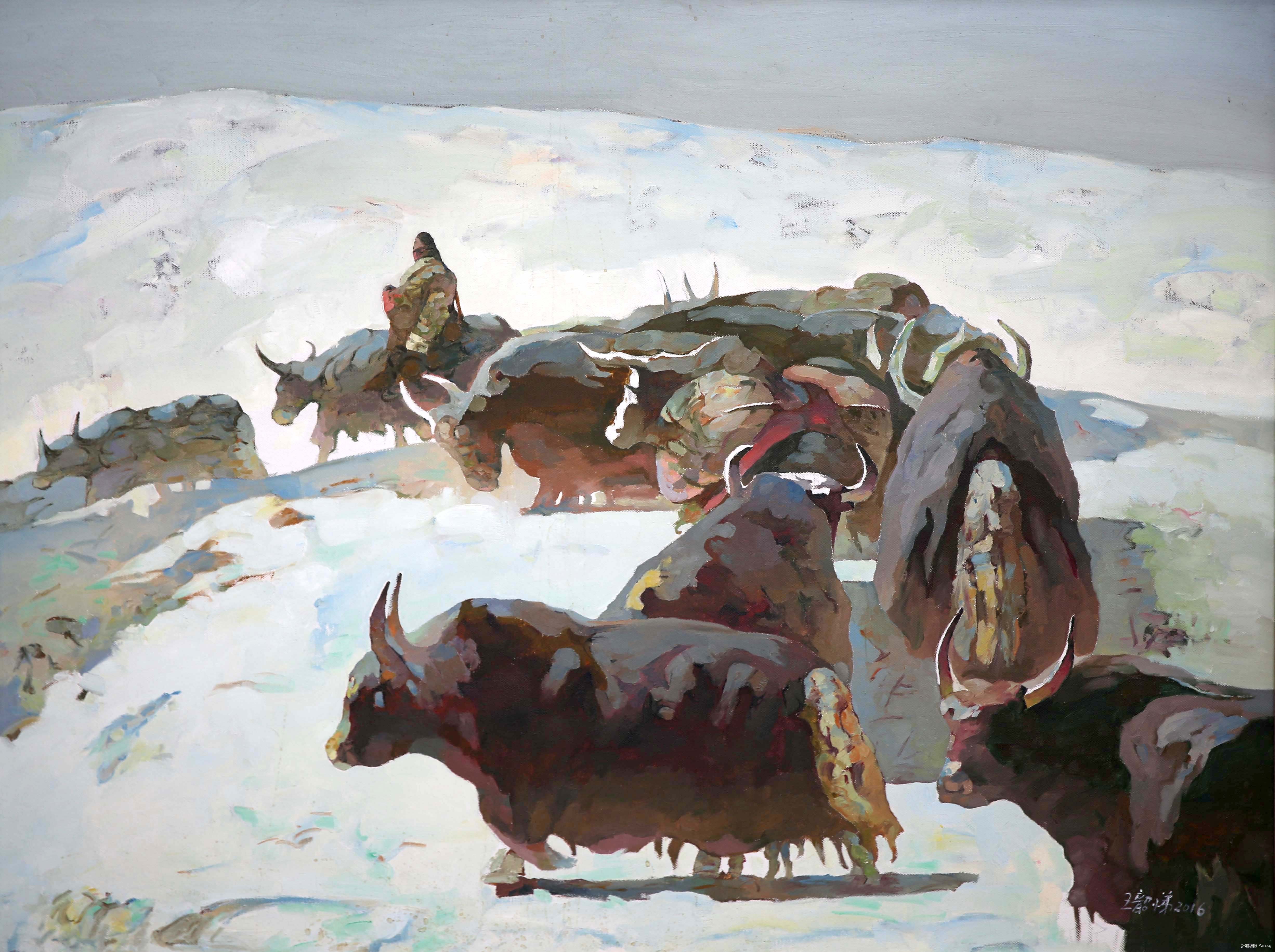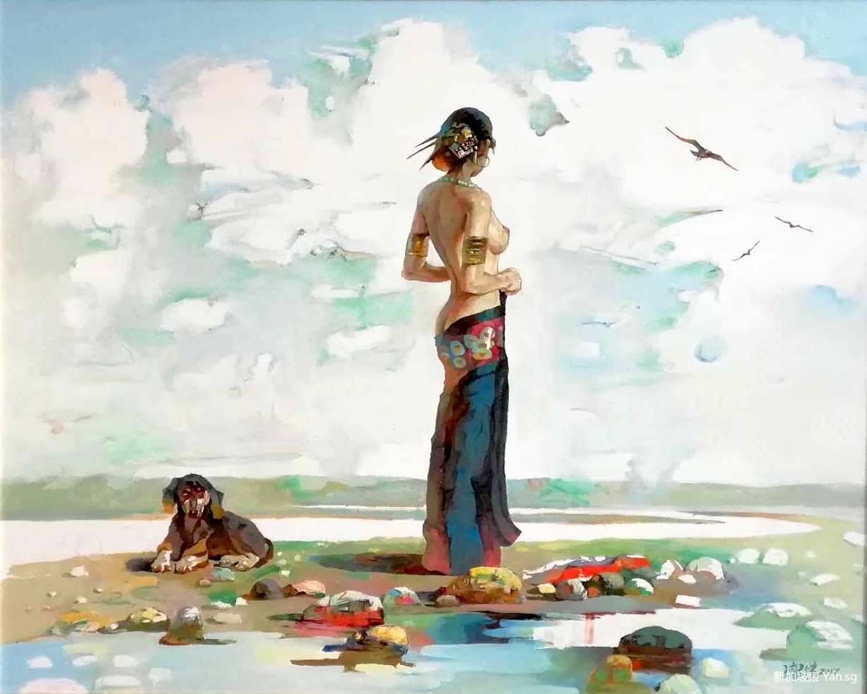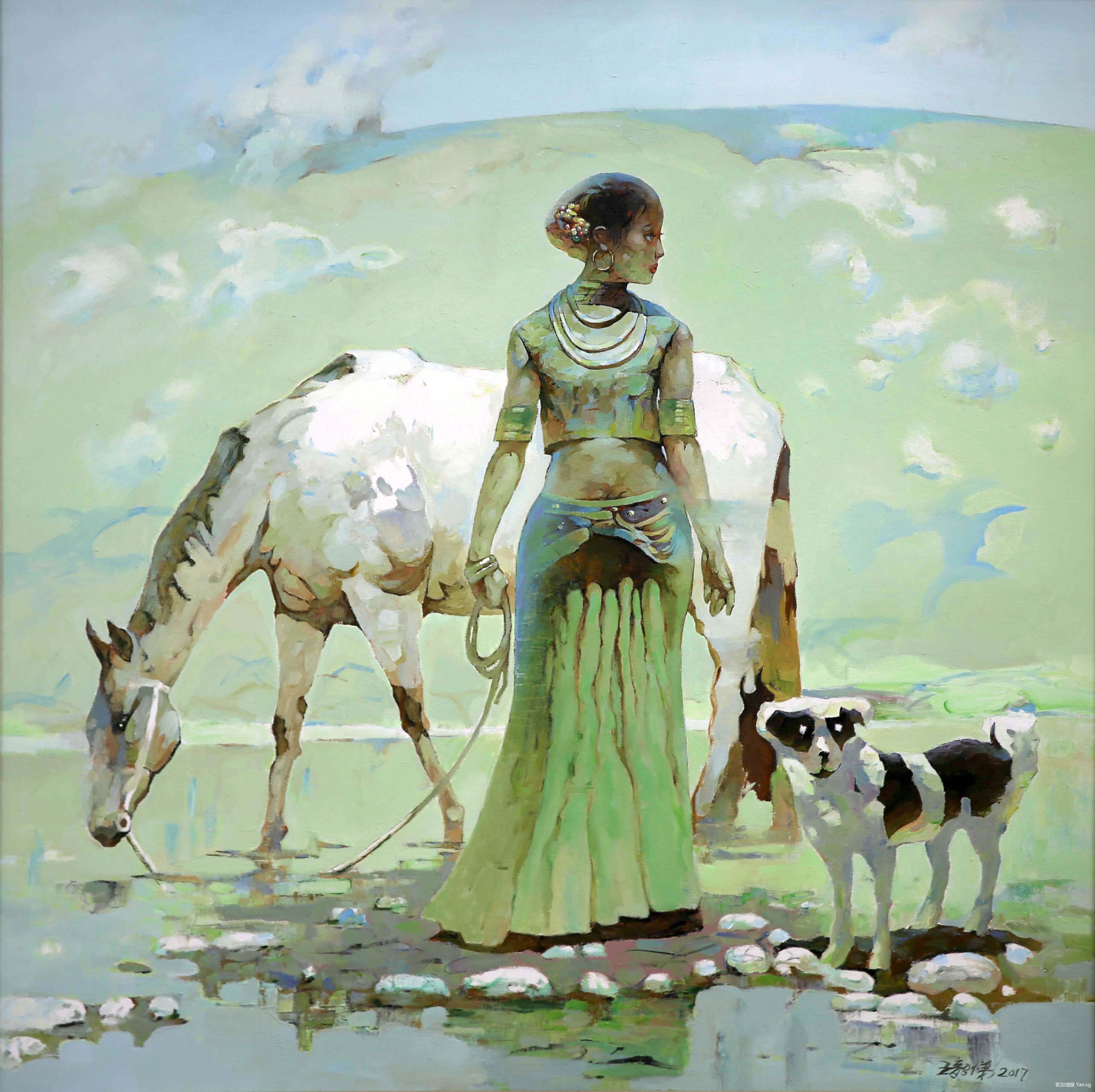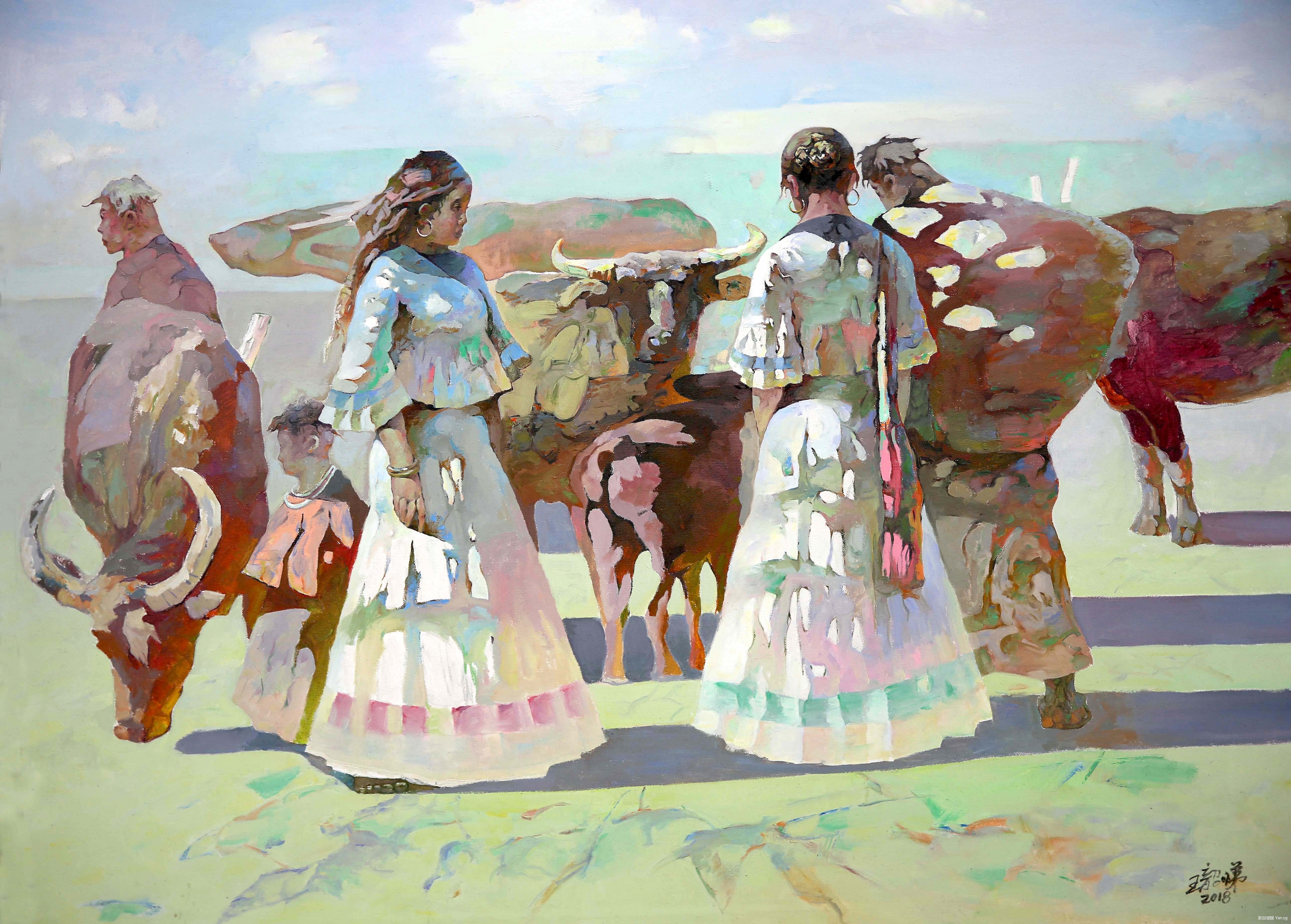 王韶悌的作品具有很强的图式识别性。他喜欢用淡绿色的冷调子来作画,他擅于运用逆光的效果来表现人物的脸庞。他在运用明暗来塑造形体的同时,将色彩的冷暖对比推向唯美的境地。此外,他还擅于运用镜头感,用仰视的手法来拉近人物与天地之间的关系:人物高挑,天空低沉,人与天空的距离并不遥远,似乎白云伸手可触,这有效的塑造了人在高原的特征。