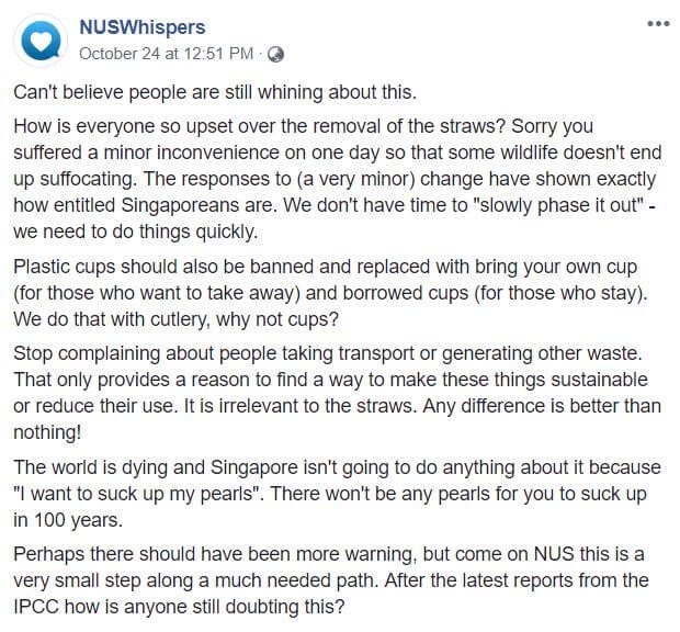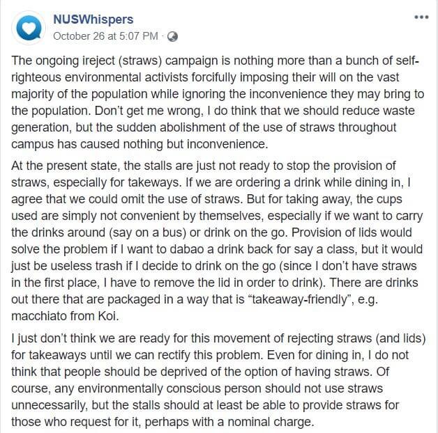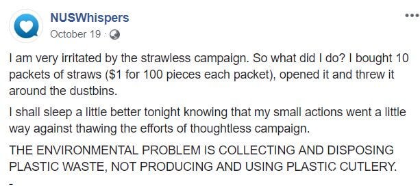 活动刚刚开始一周,就引来部分学生的不满,大家不仅在国大的匿名倾诉渠道NUSWhisper 上 diss这项运动,甚至还有人故意花钱买吸管再乱扔,以此泄愤。