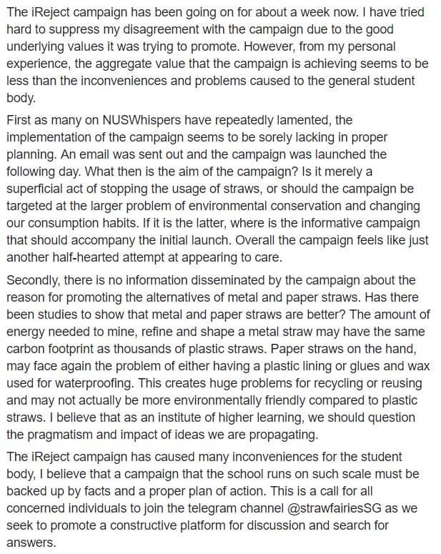 首先,尽管NUSWhispers的许多人一再感叹,但该活动的实施似乎非常缺乏适当的规划。发送了一封电子邮件,并在第二天启动了该广告系列。这项运动的目的是什么?这仅仅是一种停止使用吸管的表面行为,还是应该针对更大的环境保护问题和改变我们的消费习惯。如果是后者,那么首次发布时应该提供信息性活动。整体而言,这场运动感觉只是想试一试。