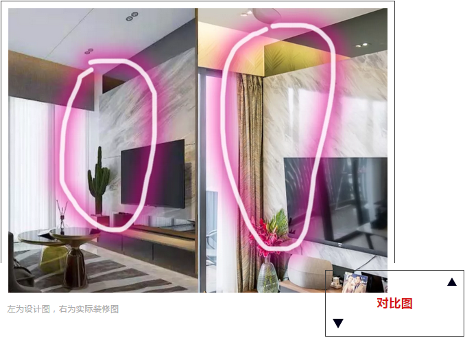 当时他们画的3D图是斜角的,看图我以为整面墙都会做电视柜,但其实他们想表达的意思是两边有留白。由于我们对3D图的认知有偏差,导致做出来的效果我不满意。