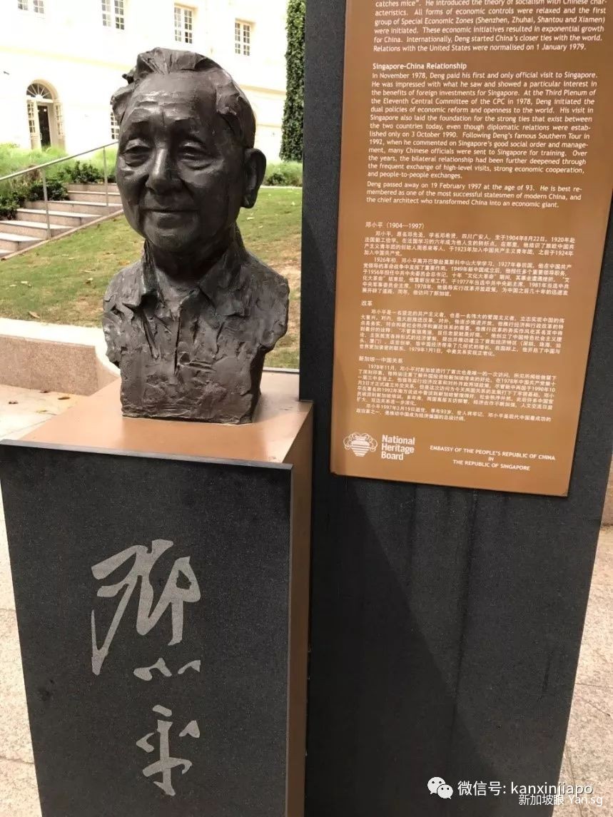 为庆祝中、新两国建交20周年,2010年11月14日,由时任内阁资政李光耀与时任的中国国家副主席习近平共同为新加坡河畔的邓小平铜像揭幕。新加坡国家文物局在新加坡河畔树立纪念碑,褒扬极少数曾到访新加坡的访客。他们必须是受到自己人民尊崇的人物,对自身的国家有杰出贡献,同时也同新加坡有所联系。其中一个就是邓小平铜像。