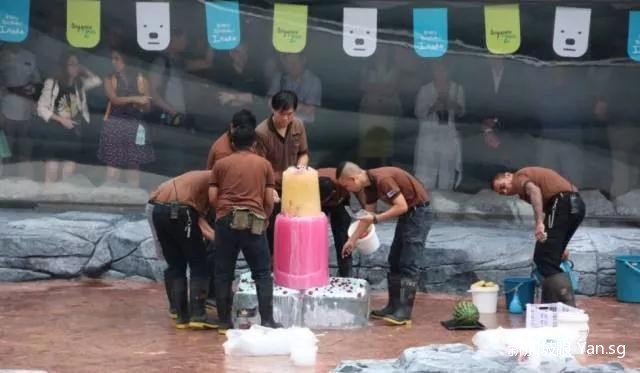 贴心的饲养员们总会准备一个巨大的生日蛋糕,还有大鱼大肉好生伺候。所以每次都会吸引很多群众围观~