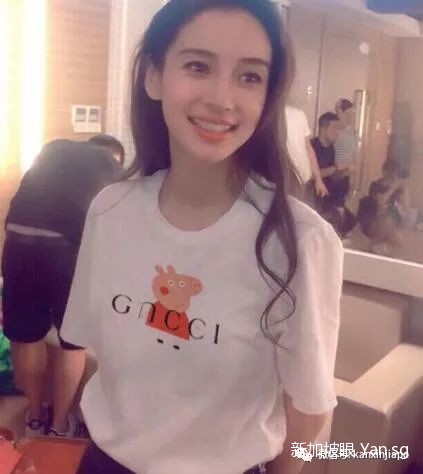 甚至还穿上了世界大牌Gucci与小猪佩奇的“联名款”!这样的Angelababy画风真的相当魔性了……当然,这件T恤是恶搞的,Gucci从来没有和小猪佩奇官方合作过。
