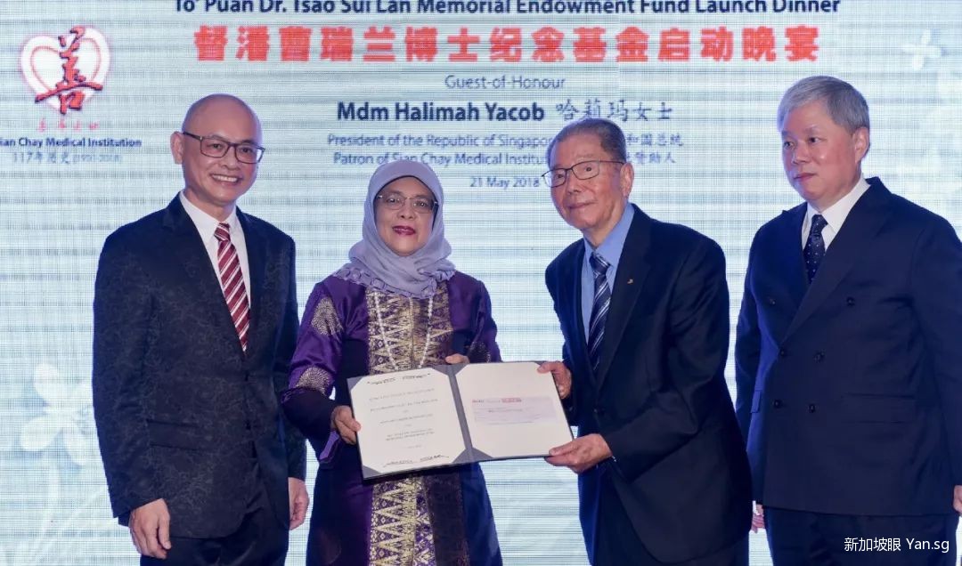 ▲新加坡总统、善济医社赞助人哈莉玛女士出席“督潘曹瑞兰博士一亿人民币纪念基金启动晚宴”活动,并为启动仪式揭牌