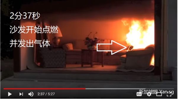 仅仅半分钟后,2分37秒,沙发开始点燃,并发出有毒且可燃的气体。家具材料是否阻燃成了关键。