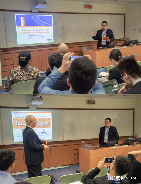 新加坡国立大学生物医学工程系主任James Goh教授课题组现场演讲,题目为“Silk-based ACL tissue regeneration”,现场与赵金忠教授展开热烈讨论,这是中新两国运动医学顶级专家课题组的面对面交流,将为后续中新两国运动医学科研及产业化合作开启新方向。