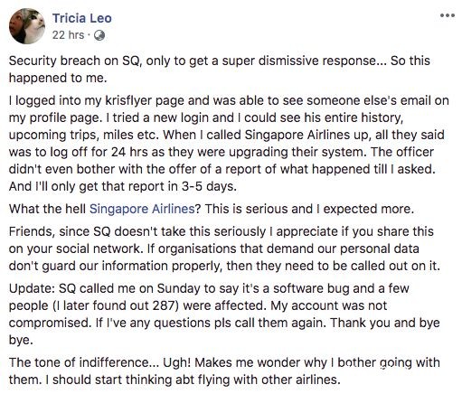 该网友致电新航后,得到的回复只是“请登出账号,24小时之后再登录。”这样的答复让网友无法接受,她在文中批评新航对乘客的隐私信息不负责任,面对乘客的问题时也没有给出解释,只是敷衍,并表示要开始考虑搭乘其他航空公司的飞机了。