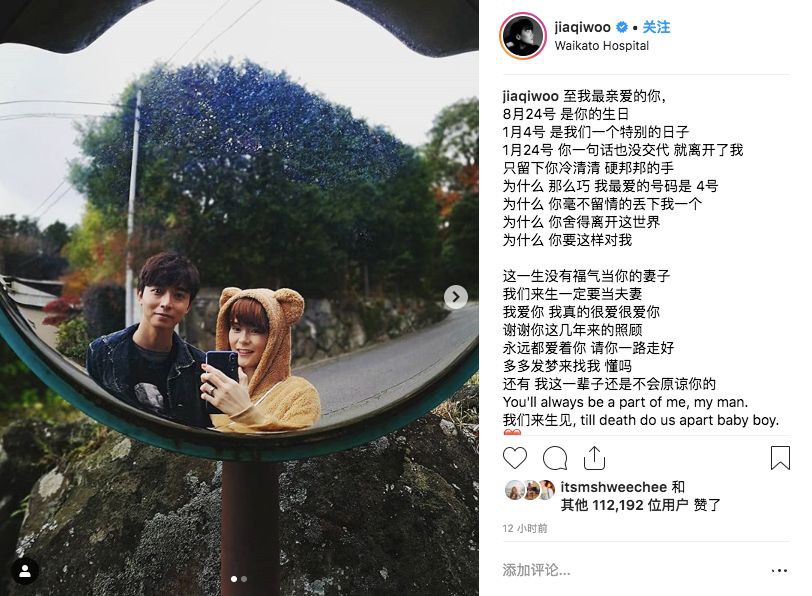她在ins上写道“这一生没有福气当你的妻子,我们来生一定要当夫妻…….谢谢你这几年来的照顾,永远都爱着你,请你一路走好,多多发梦来找我,懂吗?”