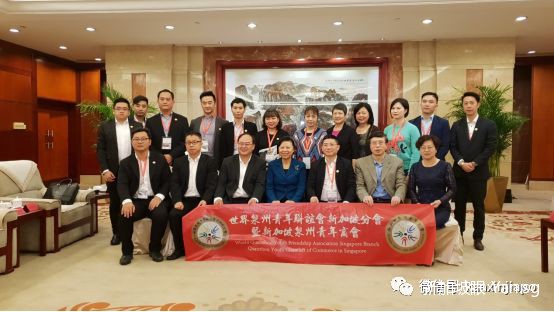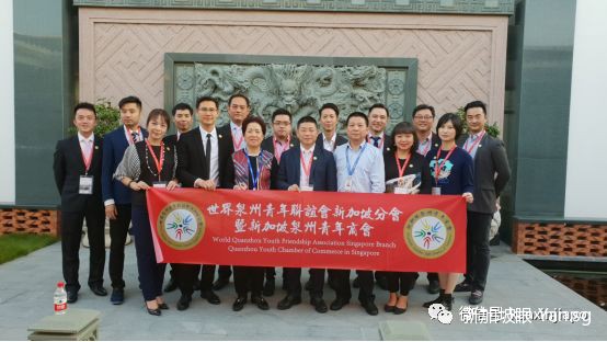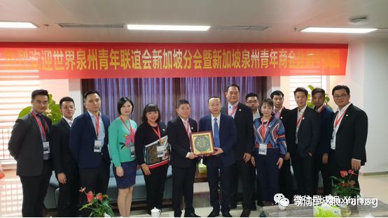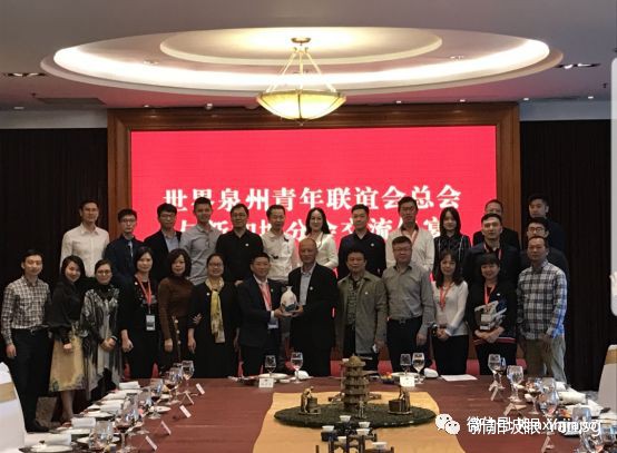 世界泉州青年联谊会(简称:世泉青)总会于泉州悦华酒店设宴,与新加坡分会进行联谊交流。访问团团长柯鸿景(前排左七)与泉州市外事侨务办副调研员康彤明(前排左八)互赠纪念品