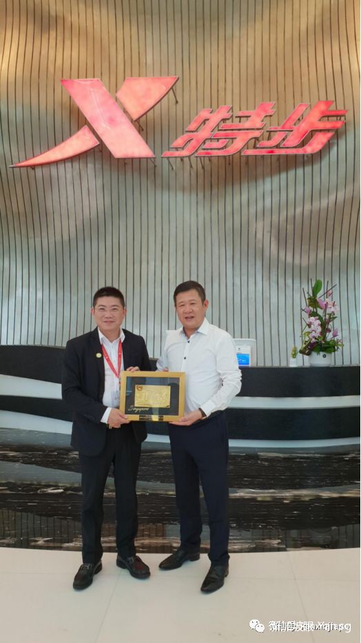 访问团团长柯鸿景赠送纪念品给特步集团董事局主席兼CEO丁水波(右)