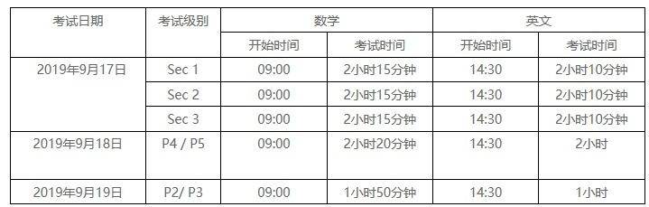 2019年度新加坡AEIS考试时间安排如下,先考中学后考小学,各位家长和同学准备好哦~而且广大家长和同学注意的是,考试需要提前45分钟到场!