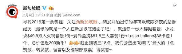 2019除夕当天,新加坡眼发出一条微博,让网友们积极与我们分享自己或美好或悲催的除夕经历,寻找2019第一条锦鲤~