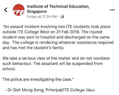 最近,新加坡工艺教育西区学院(ITE West College)校区内发生了一起持刀伤人事件,一名二年级女生捅伤了一年级的学妹!